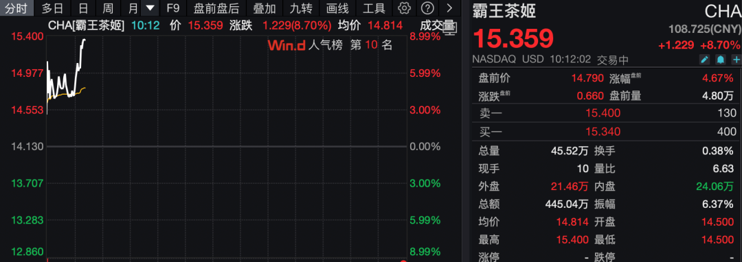其中,霸王茶姬涨近9%。11月28日晚间,霸王茶姬公布2025年第三季度财报,截至今年9月30日,霸王茶姬全球门店数达到7338家。第三季度总GMV(商品交易总额)达79.30亿元,净收入32.08亿元,经调整后净利润为5.03亿元。截至9月30日,霸王茶姬小程序注册会员用户数达2.22亿,同比增长36.7%。