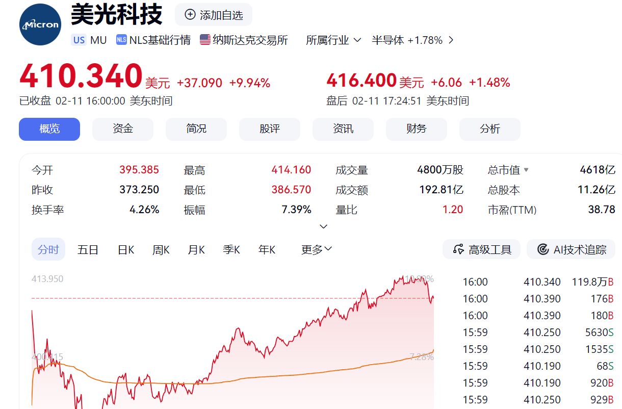 大型科技股涨跌不一,英伟达涨0.80%,苹果涨0.67%,微软跌2.15%,谷歌跌2.39%,亚马逊跌1.39%,Meta跌0.30%,特斯拉涨0.72%,博通涨0.68%,甲骨文跌1.71%,奈飞跌3.15%,美国存储芯片巨头美光科技涨9.94%。