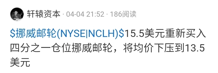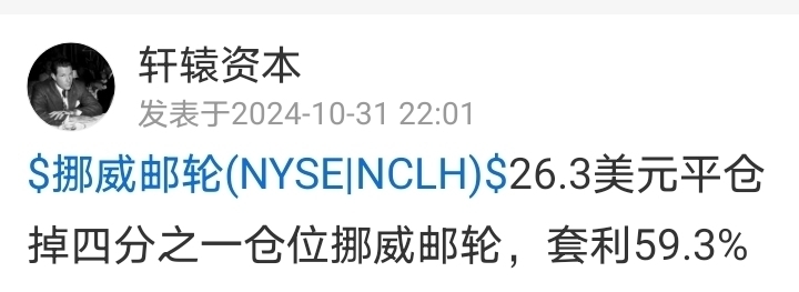 $挪威邮轮(NYSE|NCLH)$ 19.12美元平仓掉四分之一仓位挪威邮轮,套利41.6%