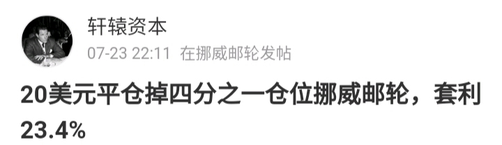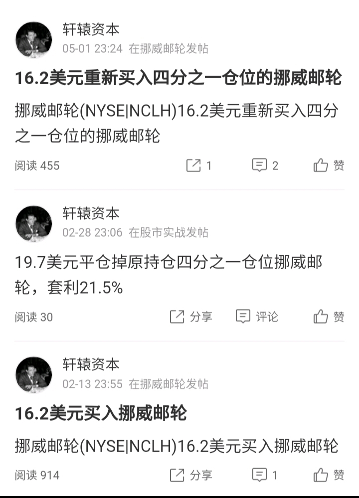 19.12美元平仓掉四分之一仓位挪威邮轮,套利41.6%