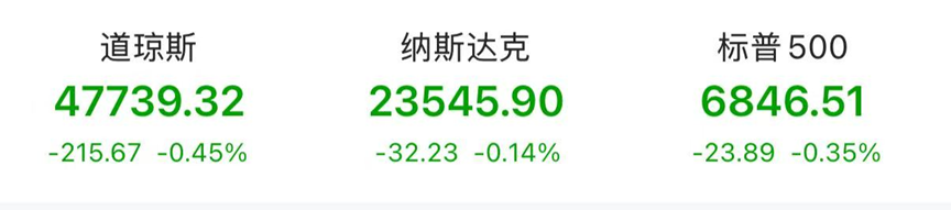美东时间周一,美股三大指数集体收跌,截至收盘,道指跌0.45%,报47739.32点;纳指跌0.14%,报23545.90点;标普500指数跌0.35%,报6846.51点。