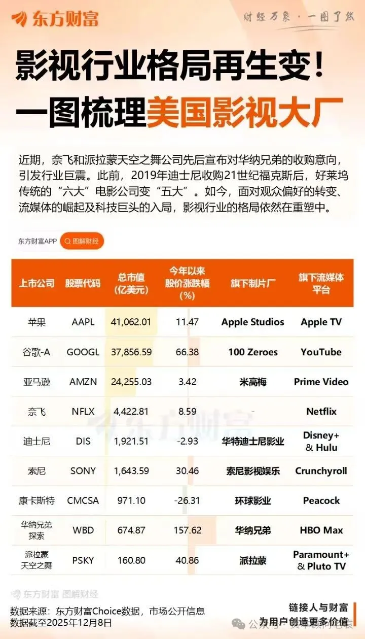 2025年12月9日,派拉蒙天舞以1084亿美元全现金报价(每股30美元)突袭华纳兄弟探索公司(WBD),剑指奈飞三天前锁定的827亿核心资产收购案——257亿美金差价,瞬间点燃好莱坞并购战。这并非突发攻势:过去12周内,派拉蒙已提交6份收购方案,报价从每股19美元逐步抬升,却始终未获华纳管理层“实质性回应”,最终选择绕过董事会直接面向股东发起敌意收购。这让人想起2000年AOL与时代华纳的世纪败局,同样是规模迷思下的豪赌,历史回响让这场博弈更具宿命感。彼时华纳市值仅674亿(12月8日收盘价27.23美元),两场溢价博弈的背后,是两种商业逻辑的生死对垒。