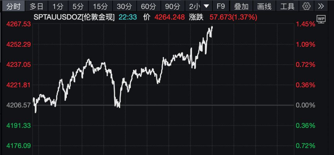 10月16日晚,美股三大指数集体高开。中概股表现相对较弱,纳斯达克中国金龙指数低开。而现货黄金继续冲高,盘中突破4260美元/盎司,再创历史新高,最新报涨1.37%。