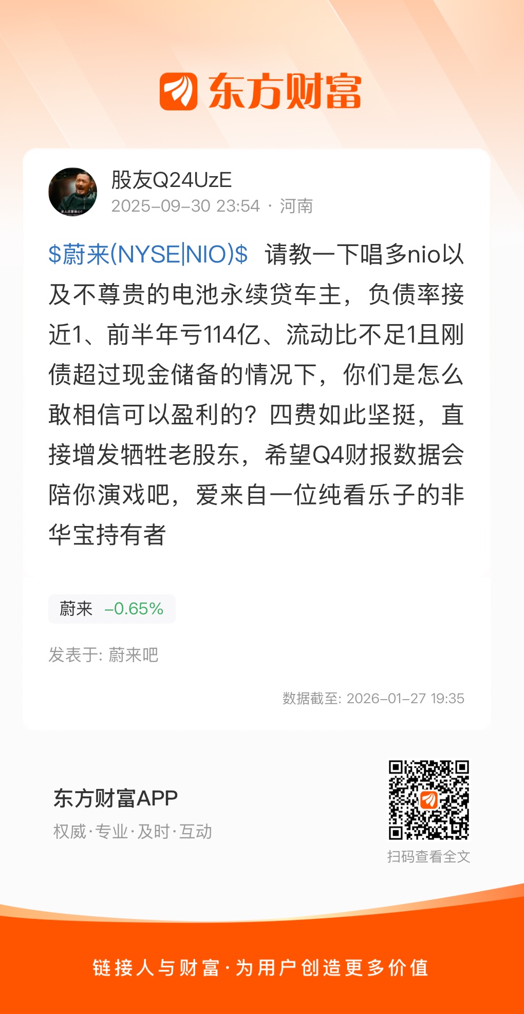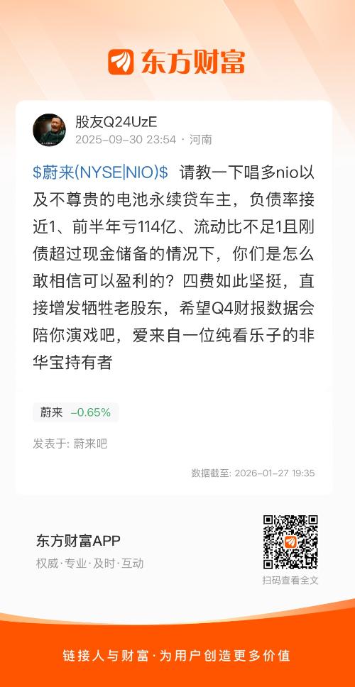 $蔚来(NYSE|NIO)$ 请教一下唱多nio以及不尊贵的电池永续贷车主,负债率接近1、前半年亏114亿、流动比不足1且刚债超过现金储备的情况下,你们是怎么敢相信可以盈利的?四费如此坚挺,直接增发牺牲老股东,希望Q4财报数据会陪你演戏吧,爱来自一位纯看乐子的非华宝持有者