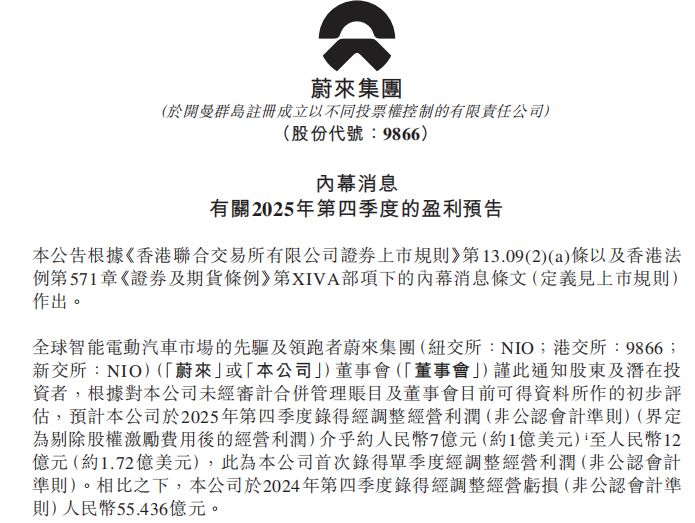 2月5日,蔚来(09866.HK)发布2025年第四季度盈利预告,预计公司2025年第四季度录得经调整经营利润(非公认会计准则)(界定为剔除股权激励费用后的经营利润),介于人民币7亿元(约1亿美元)至人民币12亿元(约1.72亿美元)。这是蔚来首次录得单季度经调整经营利润(非公认会计准则)。
