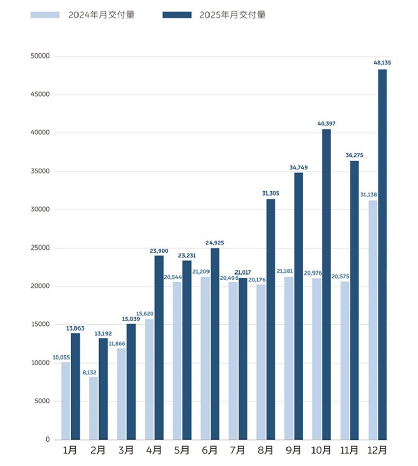 先看销量。2025年Q4,蔚来交付新车124,807辆,同比增长71.7%,创单季历史新高。其中,蔚来品牌交付67,433辆,乐道品牌交付38,290辆,萤火虫品牌交付19,084辆。单12月,蔚来交付48,135辆,同比增长54.6%。
