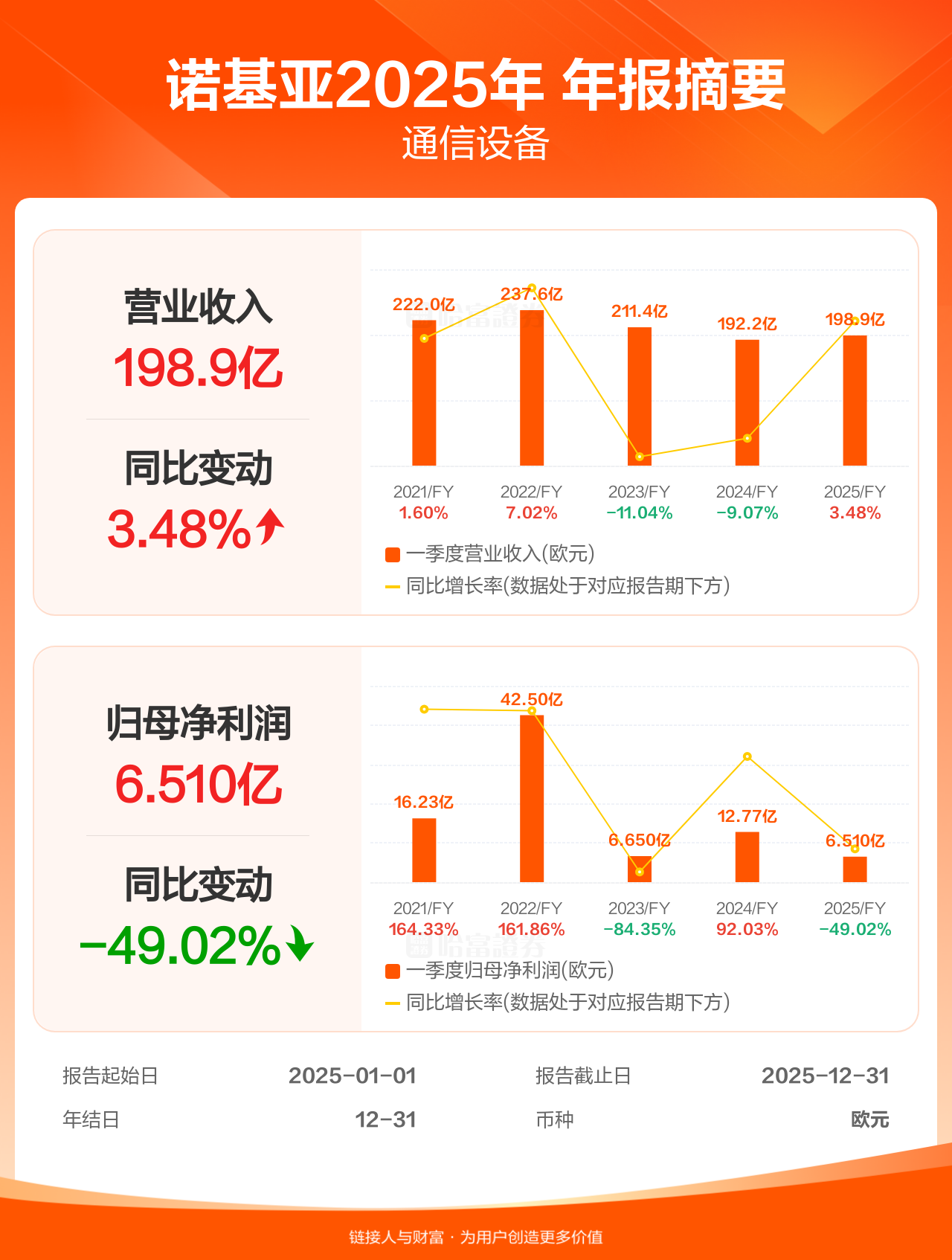 诺基亚1月29日发布年报业绩,截至2025年12月31日的12个月内,该公司营业收入198.89亿欧元,同比增长3.48%;公司权益持有人应占溢利(归母净利润)6.51亿欧元,同比减少49.02%。
