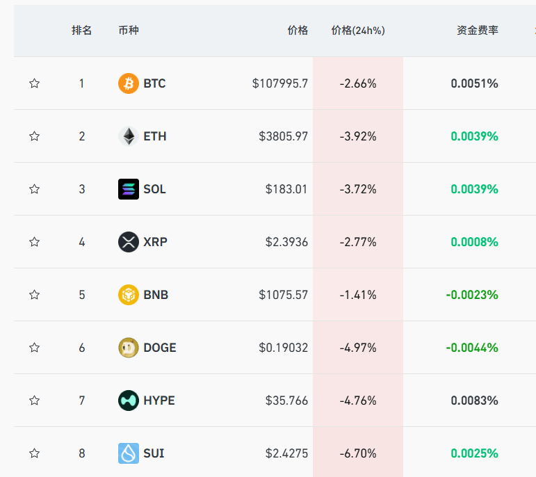 加密货币集体下跌,截至发稿,比特币跌至107995.7美元,过去24小时内跌2.66%;以太坊跌至3805.97美元,过去24小时内跌近4%。