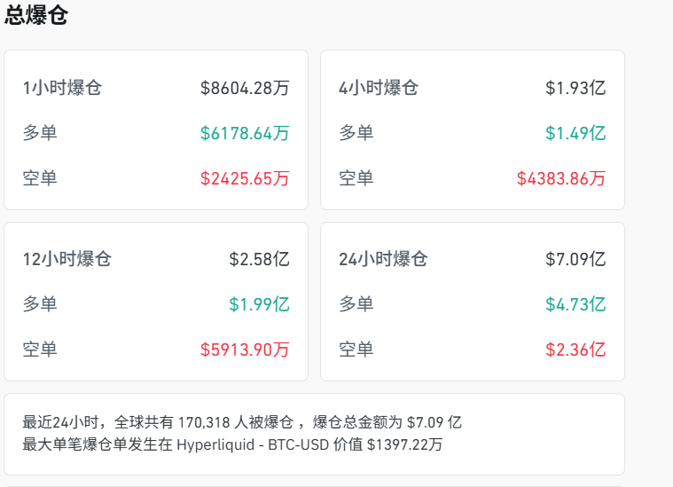Coinglass平台显示,24小时内,全球超17万人被爆仓,爆仓金额超7亿美元。