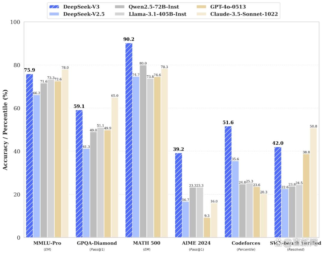 DeepSeek V3多项评测成绩超越了Qwen2.5-72B和Llama-3.1-405B等其他开源模型,并在性能上和世界顶尖的闭源模型GPT-4o(OpenAI大模型)以及Claude-3.5-Sonnet不分伯仲。