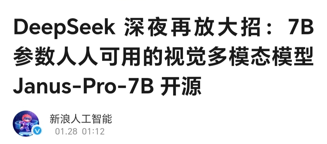 北京时间1月28日午夜消息,就在北京时间今日凌晨1点,DeepSeek 宣布开源全新的视觉多模态模型 Janus-Pro-7B。