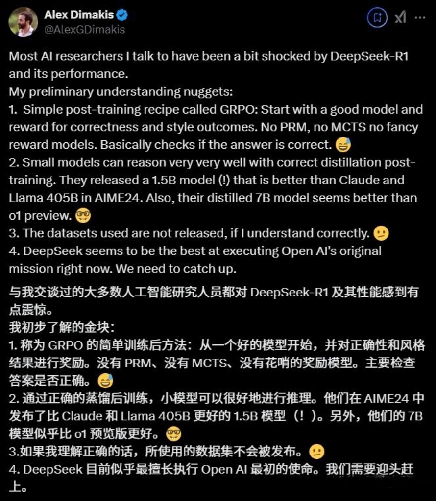 加州大学伯克利分校计算机系教授Alex Dimakis表示,AI界都对DeepSeek的性能感到有些震惊,他们采用了不同的技术路径,并且大大方方地进行了技术开源。