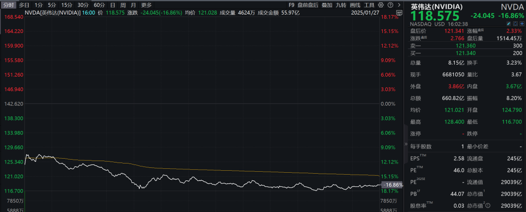 美股芯片股遭疯狂出售。英伟达收跌近17%,单日市值蒸发约5890亿美元,创美股最高纪录。