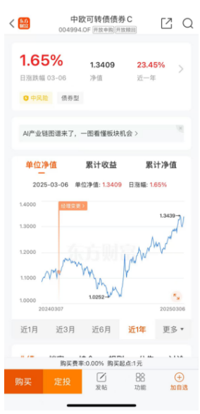 赶紧借着市场这股春风上车中欧可转债债券C(004994)了,表现一直比较强势,近