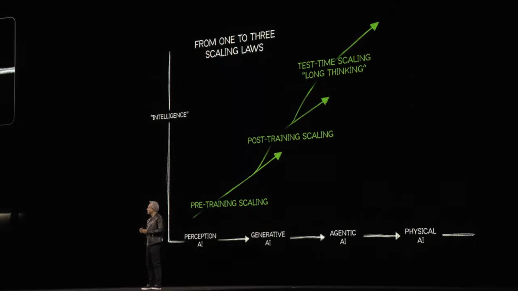 黄仁勋接着谈到,目前,我们已经拥有了3条缩放法则(Scaling Law):从感知AI到生成式AI的预训练扩展,到更强生成式AI的后训练扩展,再到长思考模型的测试时训练扩展,让AI学会了推理。黄仁勋指出,缩放法则其实依然有效,甚至超出预期:“去年,几乎全世界都搞错了。大家以为缩放法则失效,但实际上,现在AI推理所需的计算量比去年人们所以为的要高出100倍。”