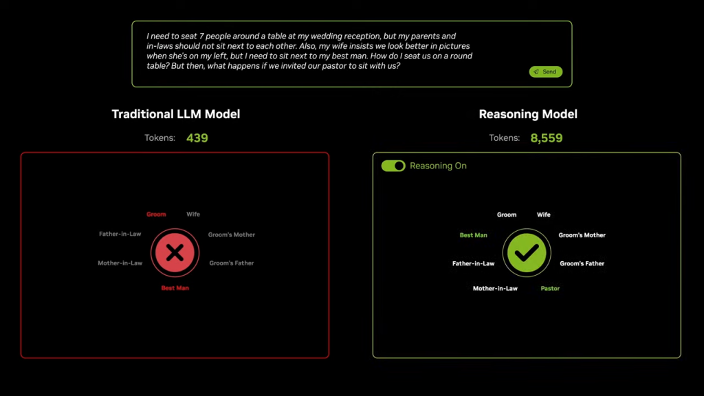为了验证这一点,英伟达将“传统模型”Llama 3.3与推理模型DeepSeek R1进行了对比。在回答同一个关于婚礼座位安排的问题时,Llama 3.3 70B模型在一次推理中使用了439个tokens,虽然耗时较短,但得出了错误的答案。而DeepSeek R1模型则使用了近9000个tokens,虽然耗费了更多的计算资源和时间,但得出了正确答案。