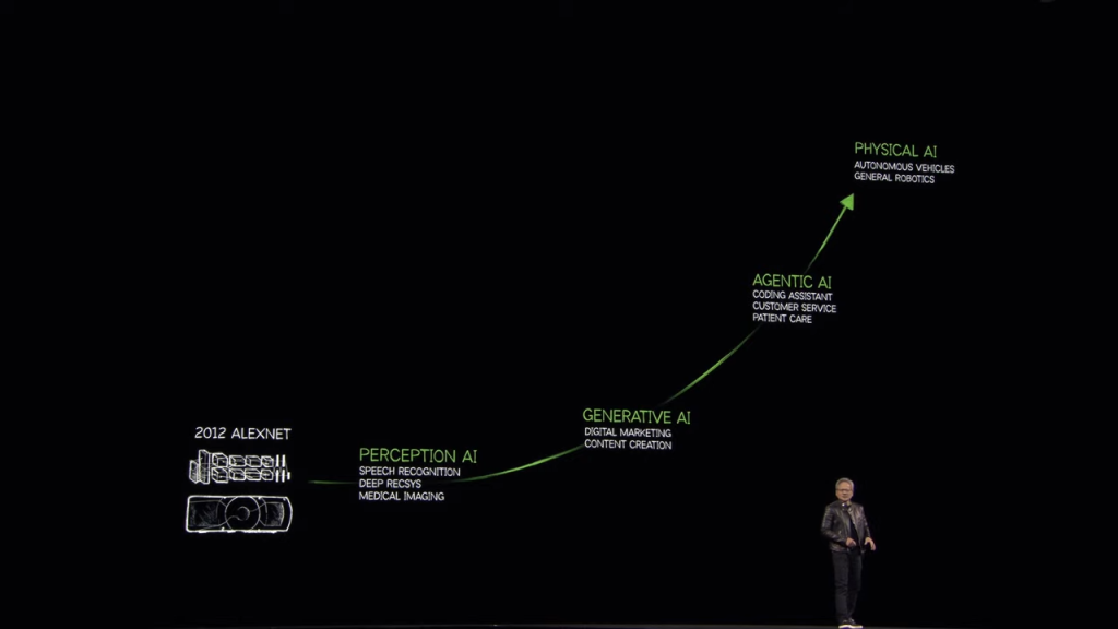 回顾英伟达一路走来的历程,黄仁勋表示,今年已是GeForce显卡诞生以来的第25年。在大约十年前,始于感知人工智能和计算机视觉的AI开始真正进入全世界的视野。目前,我们正处于生成式人工AI阶段,将走向智能体AI时代,随后是物理AI时代,也就是机器人将登场的地方。
