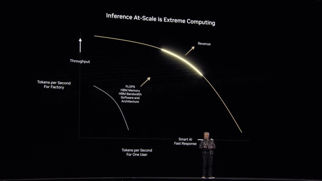 在今天的演讲中,推理成为了关键词。黄仁勋展示了一张图表,两条轴中一条显示用户每秒处理的标记数,另一条显示工厂每秒处理的标记数。黄仁勋指出,“大规模的推理是一种极端的计算任务”,需要确保AI既智能又能响应迅速,“这一切都是为了攻克推理问题”。