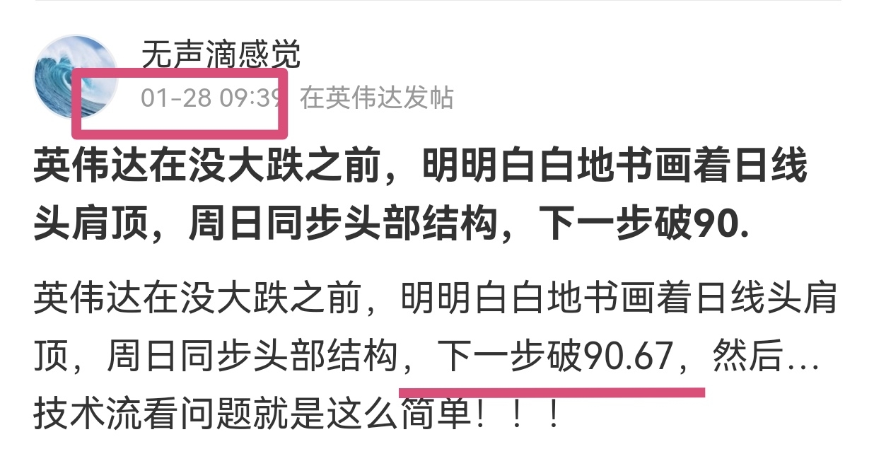 而在两个月前的1月28日,我己明确而清晰地指出英伟达将破90.67。如下图。