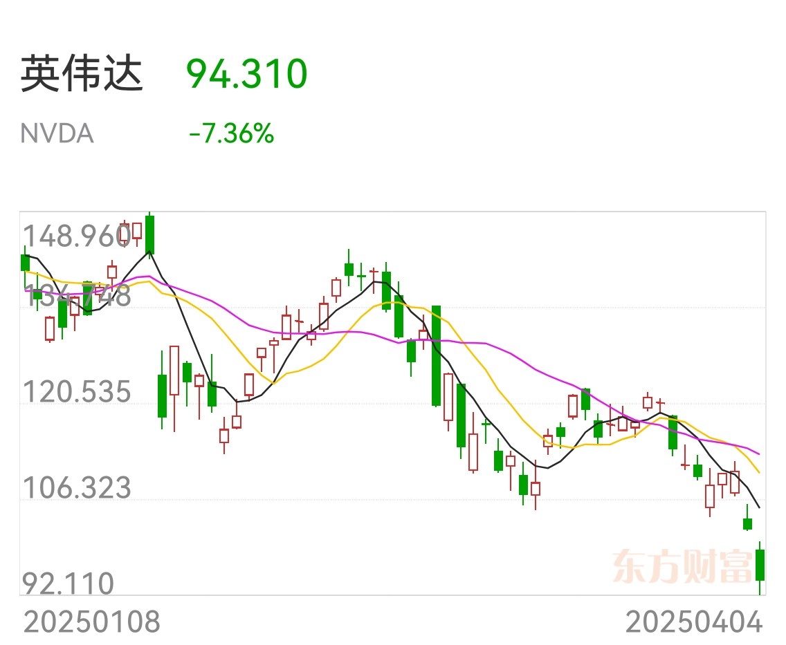 今天4月4日,历史书上又浓墨重彩地写上一笔,美科技七巨头之一的英伟达,创造了四个月以来的新低,最低到92.11,离预测点位只有微弱误差。