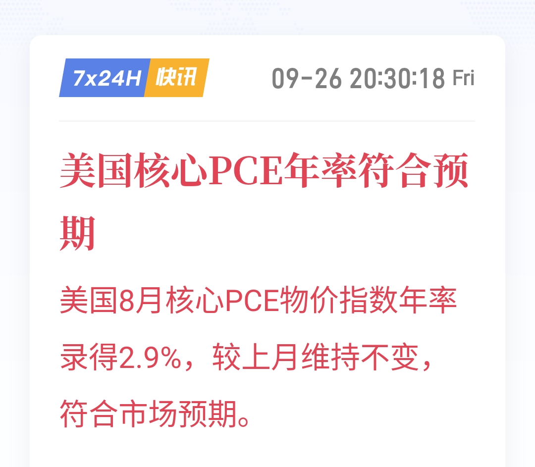 美国8月核心PCE物价指数年率录得2.9%,较上月维持不变,符合市场预期。