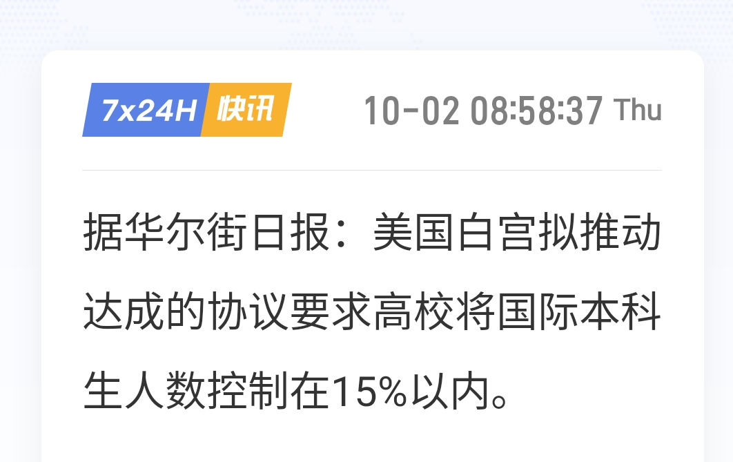 $英伟达(NASDAQ|NVDA)$ $纳斯达克(NASDAQ|NDAQ)$ #股市怎么看# 美国白宫拟推动达成的协议要求高校将国际本科生人数控制在15%以内。