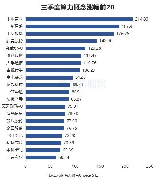 个股而言,算力概念中的“易中天”“纪连海”等个股,在三季度也大放异彩。比如工业富联,在三季度大涨214.8%,最新市值达1.31万亿元,排在A股第9位。新易盛、中际旭创、天孚通信、寒武纪等也在三季度股价翻倍。