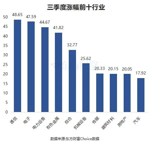 从A股三季度的行业表现来看,也能感受到AI带来的科技狂热。东方财富Choice数据显示,三季度通信居行业涨幅榜首位,累计上涨48.65%。电子紧随其后,三季度上涨47.6%。