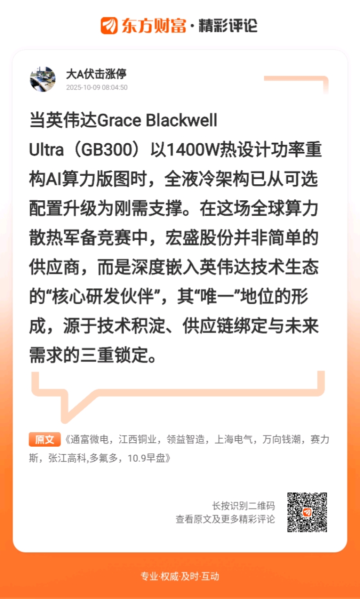 //@大A伏击涨停 :当英伟达Grace Blackwell Ultra(GB300)以1400W热设计功率重构AI算力版图时,全液冷架构已从可选配置升级为刚需支撑。在这场全球算力散热军备竞赛中,宏盛股份并非简单的供应商,而是深度嵌入英伟达技术生态的“核心研发伙伴”,其“唯一”地位的形成,源于技术积淀、供应链绑定与未来需求的三重锁定。 $英伟达(NASDAQ|NVDA)$$多氟多(SZ002407)$$万向钱潮(SZ000559)$