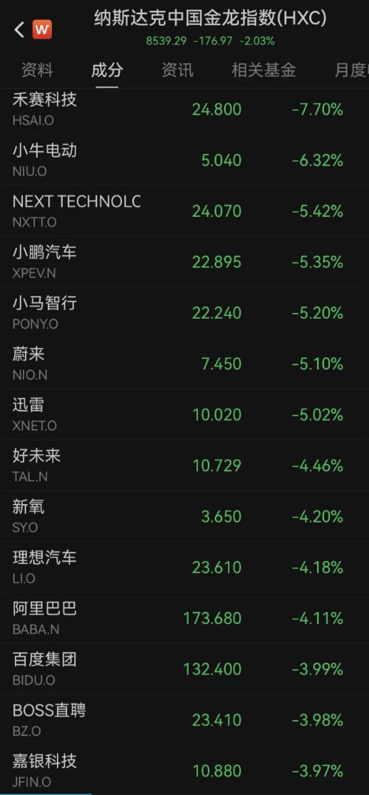 热门中概股多数下跌,纳斯达克中国金龙指数跌2.03%。亿鹏能源跌逾17%,禾赛科技跌逾7%,小鹏汽车、蔚来等跌逾5%,阿里巴巴、理想汽车等跌逾4%。EPSIUM ENTERPRISE涨逾13%,阿特斯太阳能涨逾11%,哔哩哔哩涨近3%。