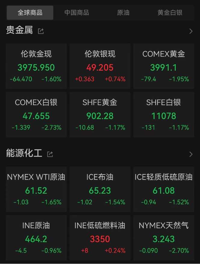 商品市场方面,截至当地时间10月9日收盘,现货白银价格上涨0.74%,盘中一度突破50美元/盎司,创历史新高;COMEX白银期货跌2.73%。现货黄金价格下跌1.60%,报3975.95美元/盎司;COMEX黄金期货下跌1.95%,报3991.1美元/盎司。