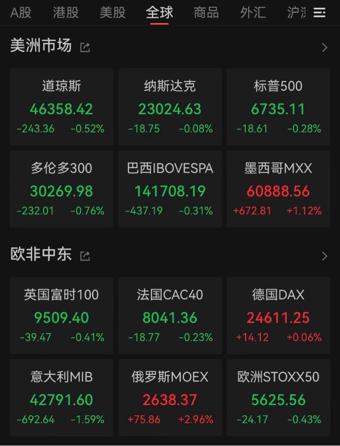 欧洲主要股指多数下跌。截至收盘,英国富时100指数下跌0.41%,法国CAC40指数下跌0.23%,意大利MIB指数下跌1.59%,欧洲STOXX50指数下跌0.43%,德国DAX指数上涨0.06%。