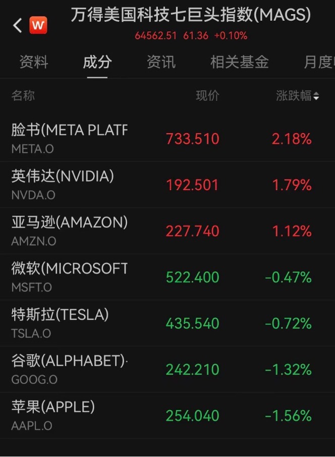 美股大型科技股涨跌不一,万得美国科技七巨头指数上涨0.10%。英伟达股价再创历史新高,收盘上涨1.79%,最新市值为46778亿美元。Meta上涨2.18%,亚马逊上涨1.12%,微软下跌0.47%,特斯拉下跌0.72%,谷歌-C下跌1.32%,苹果下跌1.56%。