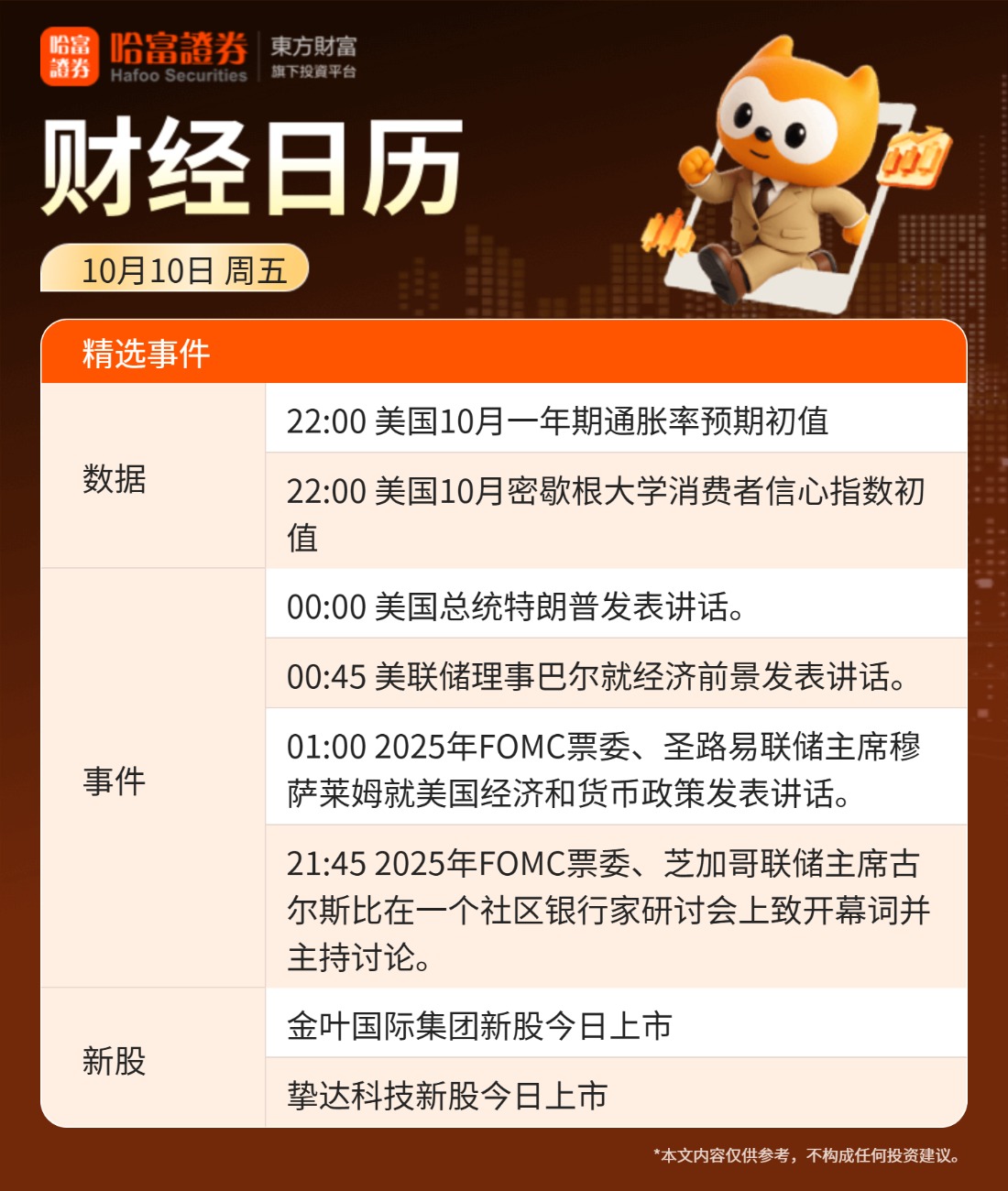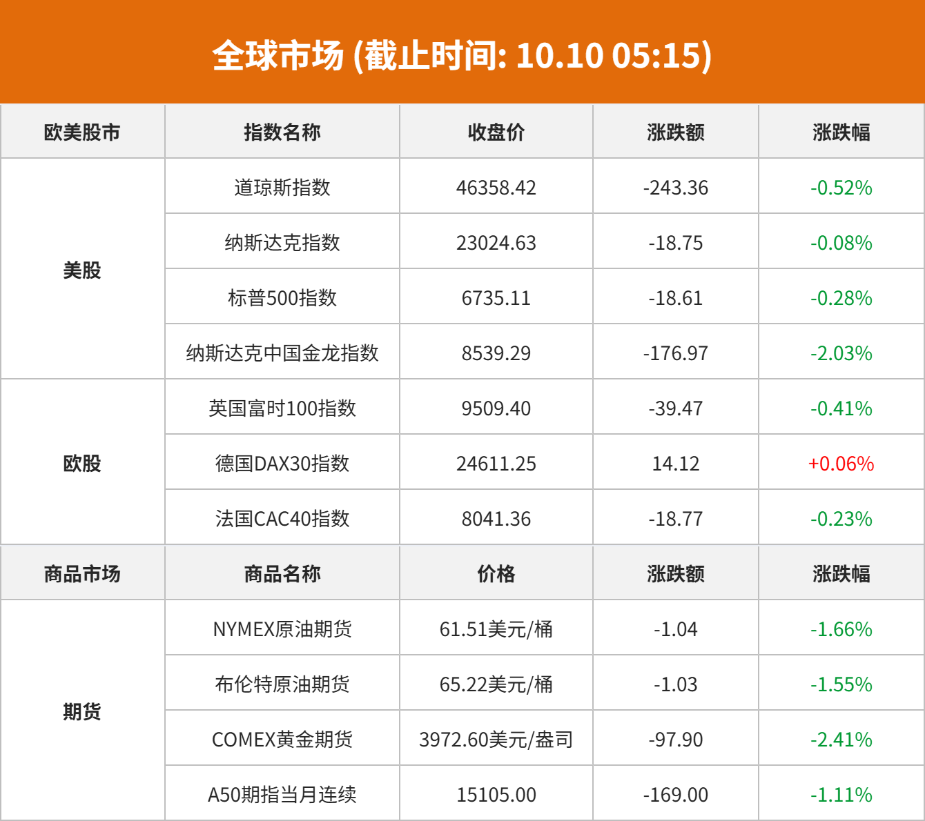 美股市场:美股三大指数10月09日收盘全线下跌。截至收盘,道琼斯工业平均指数比前一交易日下跌243.36点,收于46358.42点,跌幅为0.52%;标准普尔500种股票指数下跌18.61点,收于6735.11点,跌幅为0.28%;纳斯达克综合指数下跌18.75点,收于23024.63点,跌幅为0.08%。