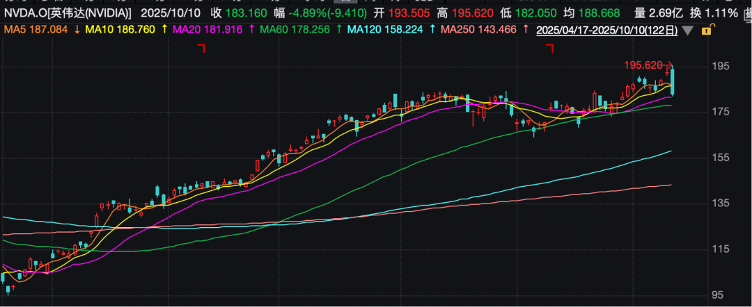 从近期股价表现来看,10月1日黄仁勋开启当月首轮减持时,英伟达股价开盘价为185.3美元,此后在黄仁勋持续减持的同时,英伟达股价逐步攀升,10月10日盘中最高触及195.62美元,创下公司上市以来的历史新高,显示资金承接意愿强劲。