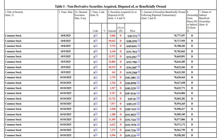 美东时间10月10日盘后,美国证券交易委员会(SEC)披露的最新文件显示,英伟达CEO黄仁勋在近期开启密集减持动作。其中,10月8日至10日短短3天内,黄仁勋通过20笔分散交易售出22.5万股英伟达股票,平均每股成交价格约190.2美元,累计套现金额约4280万美元;而在此之前的10月1日至7日,他已保持“每日减持7.5万股”的稳定节奏,连续五个交易日操作,每股成交均价区间在186.8美元至191.5美元,累计套现超7024万美元。
