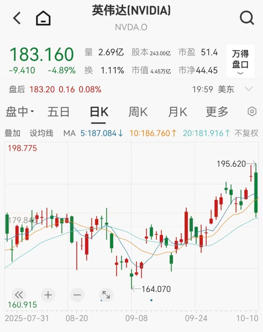10月10日,英伟达盘中最高触及195.62美元的历史新高,随后大跌4.89%,最新市值为4.45万亿美元。该股年内累计涨超36%,远超标普500指数同期涨幅。