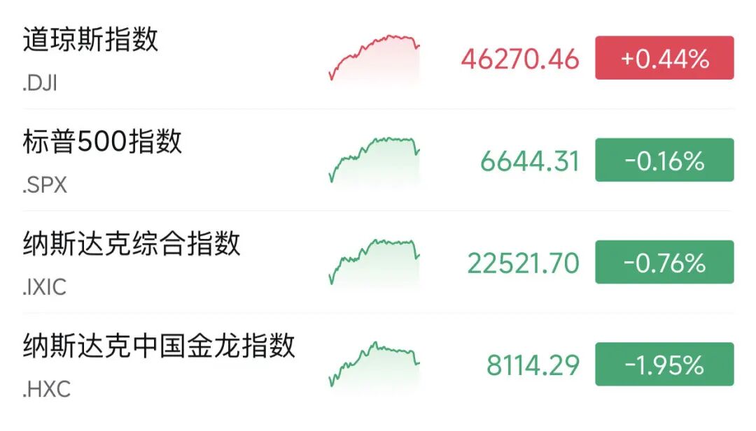 当地时间周二,美国股市三大股指收盘涨跌互现,其中道琼斯工业指数涨0.44%,报46270.46点;标普500指数跌0.16%,报6644.31点;纳斯达克指数跌0.76%,报22521.7点。
