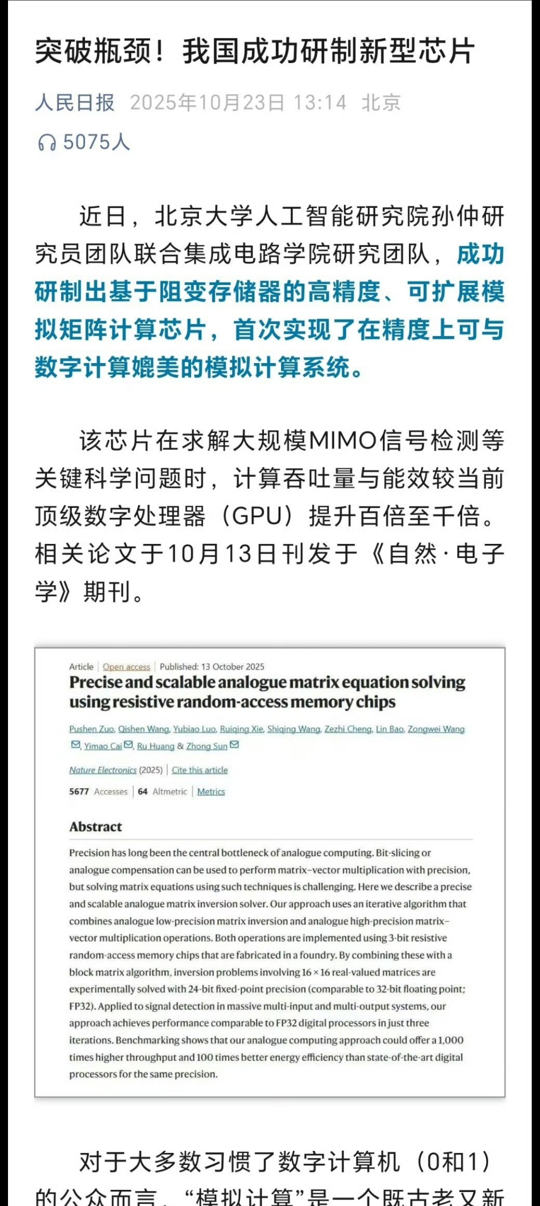 $英伟达(NASDAQ|NVDA)$ 惊天大变局算力不再需要传统GPU,AI芯片不再需要英伟达。开辟新赛道,基于阻变存储器的电力电压模拟计算芯片。