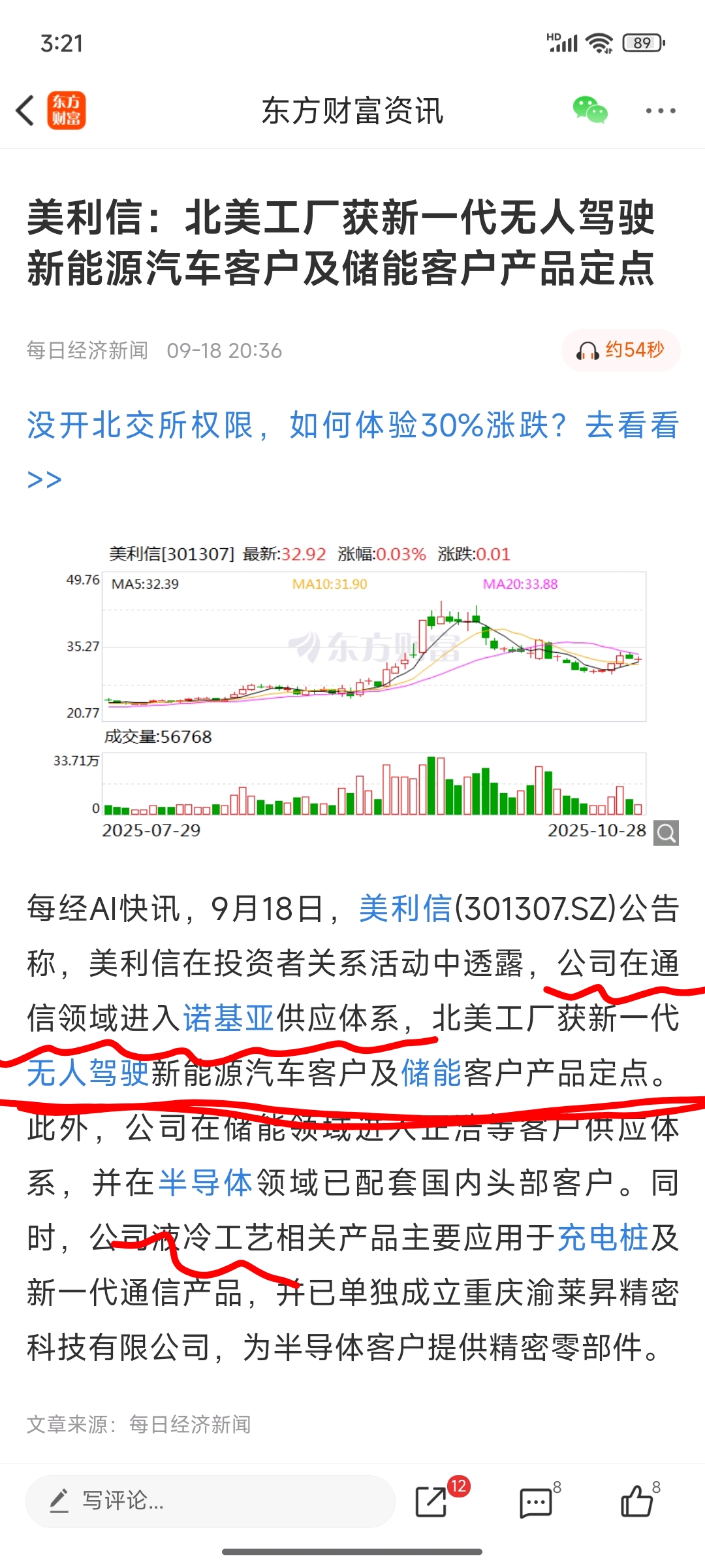 $英伟达(NASDAQ|NVDA)$ $美利信(SZ301307)$ 英伟达新业务,美利信全部完美契合,与诺基亚合作切入6g通讯领域,美利信是诺基亚供应商(同时也是华为,爱立信,三星等头部通讯公司供应商,供应5g、6g及通讯液冷产品)。另外美利信北美工厂,可以直接提供无人驾驶零部件、机器人零部件、储能产品(已供货特斯拉)。