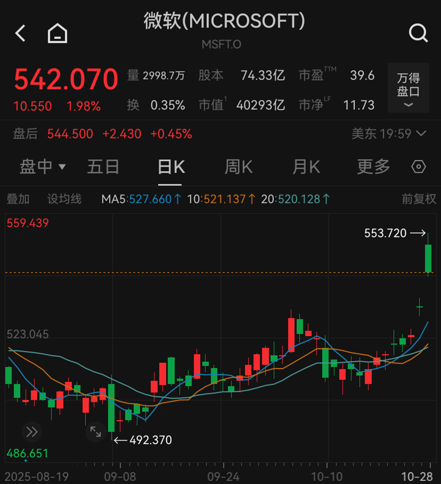 盘面上,大型科技股多数上涨。周二美股早盘,微软一度涨超4%,收盘涨幅收窄至2%附近,总市值收于4万亿美元上方。
