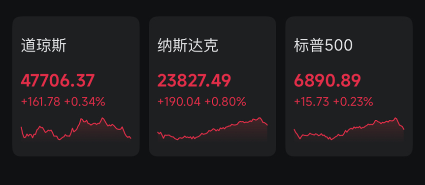 当地时间周二,美股三大股指全线收涨。截至收盘。道指涨0.34%报47706.37点,标普500指数涨0.23%报6890.89点,纳指涨0.8%报23827.49点,均续创历史新高。