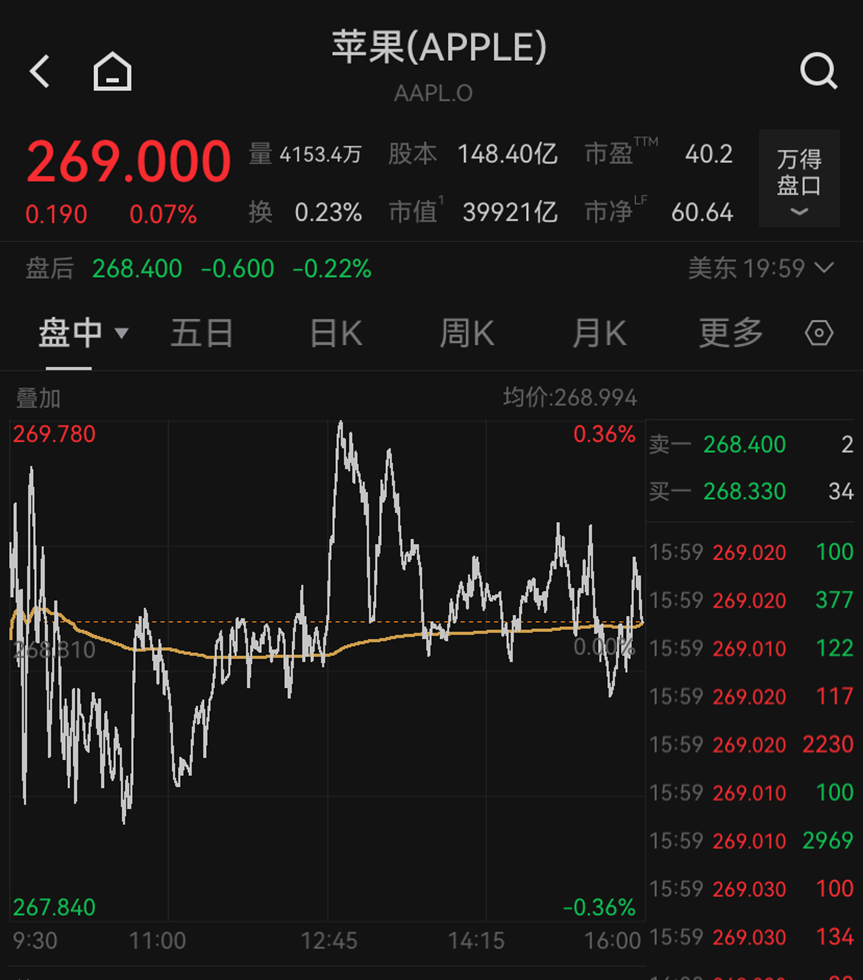 苹果股价早盘一度涨近0.4%报每股269.87美元,使其市值短暂突破4万亿美元关口,成为历史上第三家触及这一里程碑的上市公司。截至收盘,苹果报269美元/股,总市值3.99万亿美元。