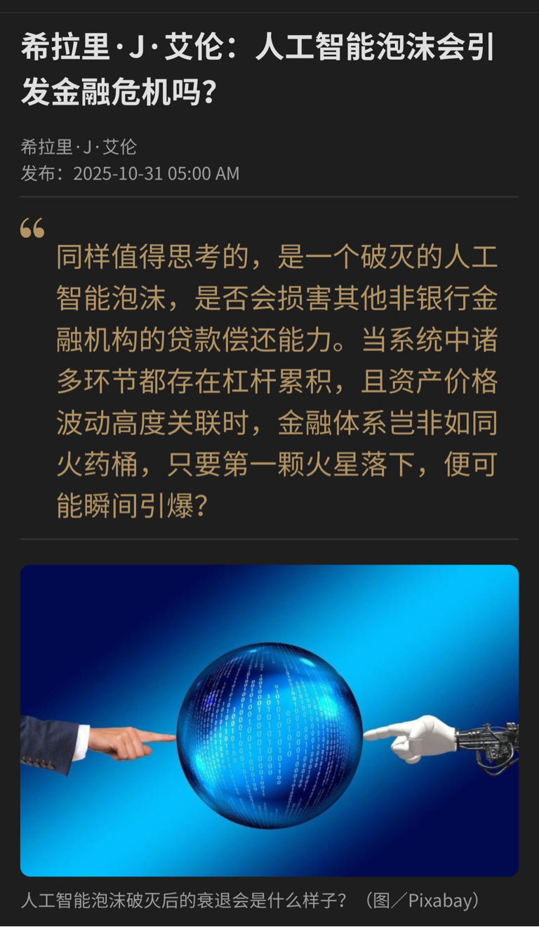 美国已经开始讨论对人工智能AI过度吹捧,巨大资金投资加杠杆,即易引发金融体系泡沫
