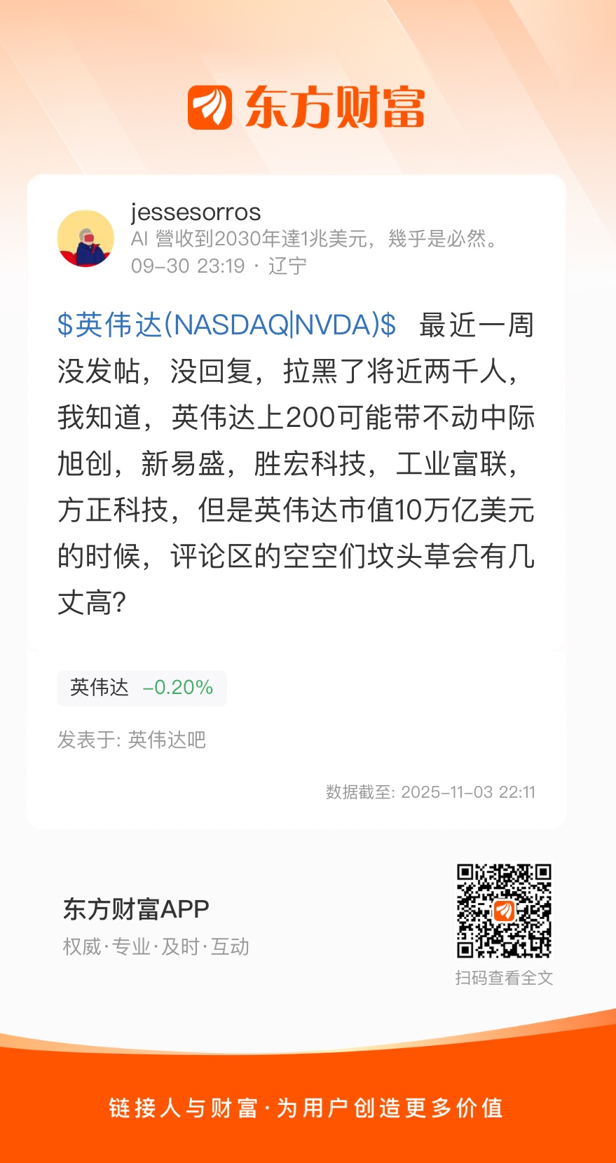 $英伟达(NASDAQ|NVDA)$ 最近一周没发帖,没回复,拉黑了将近两千人,我知道,英伟达上200可能带不动中际旭创,新易盛,胜宏科技,工业富联,方正科技,但是英伟达市值10万亿美元的时候,评论区的空空们坟头草会有几丈高?