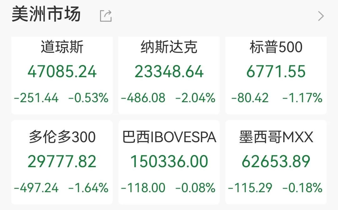 大型科技股普跌,英特尔跌超6%;特斯拉跌超5%,市值一夜蒸发802亿美元(约合人民币5718亿元);英伟达跌超3%,市值一夜蒸发1990亿美元(约合人民币14188亿元);谷歌跌逾2%;亚马逊、Meta跌超1%;苹果小幅上涨。