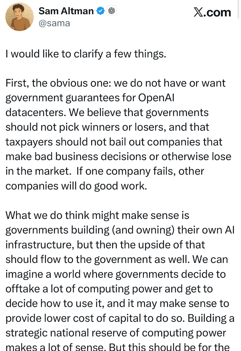 奥尔特曼也在7日凌晨紧急发文“救火” ,这一帖子全文近2000字,其中奥尔特曼称“不需要也不想要美国政府为OpenAI数据中心提供担保”。