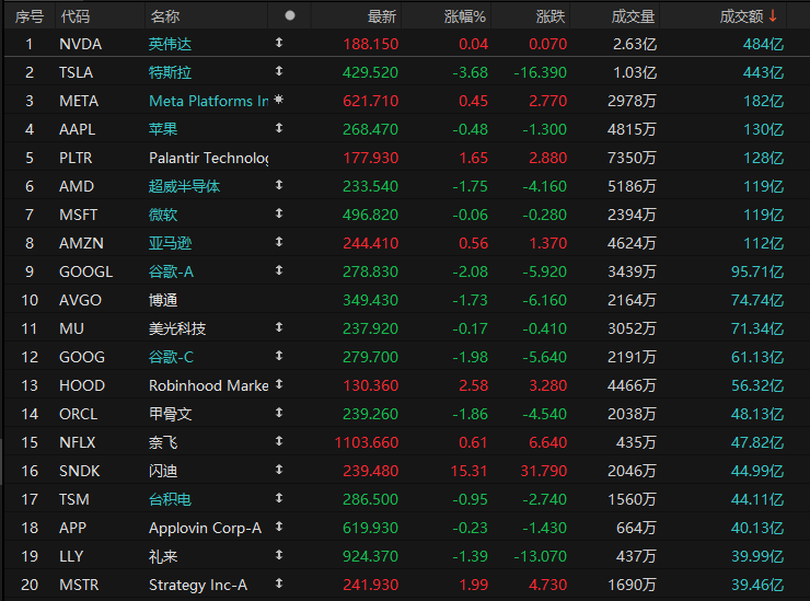 第3名Meta Platforms收高0.45%,成交182亿美元。该公司周五发布公告,确认该公司将于2028年前在美国投资6000亿美元,用于建造人工智能数据中心等基建和人才招募等。