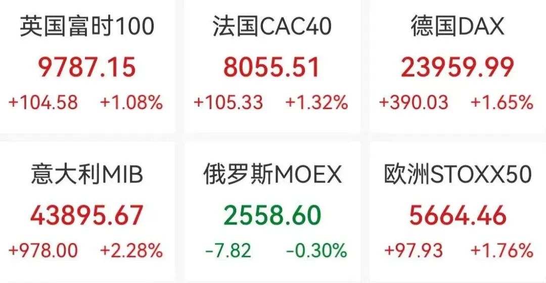 当地时间周一(11月10日),欧美股市集体收涨,欧洲主要股指均涨逾1%;美国三大股指全线收涨,道指涨0.81%,标普500指数涨1.54%,纳指涨2.27%。