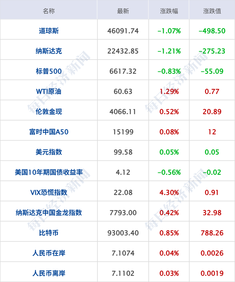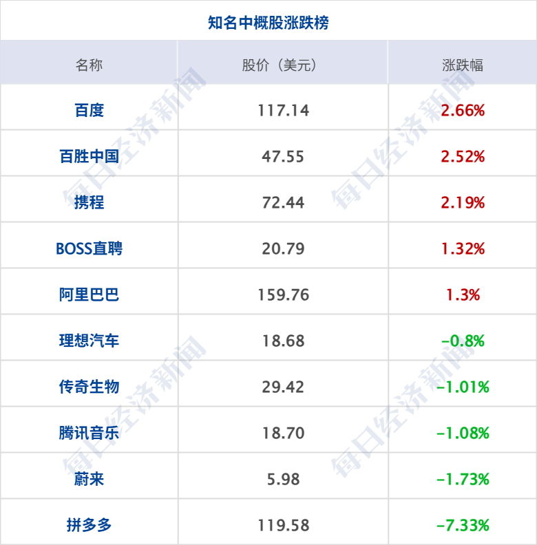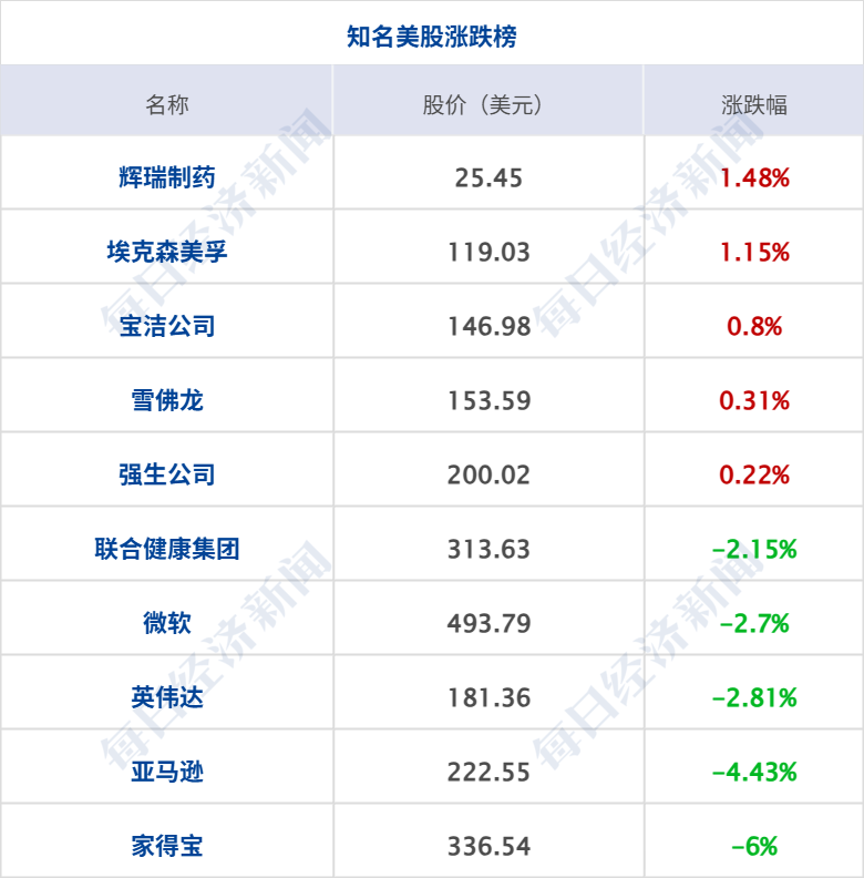 美股三大指数集体收跌,道琼斯指数跌1.07%,标普500指数跌0.83%,纳斯达克综合指数跌1.21%;大型科技股多数下挫,亚马逊、AMD跌超4%,微软、英伟达跌近3%,特斯拉跌超1%。中概股涨跌互现,纳斯达克中国金龙指数涨0.42%,爱奇艺涨超6%,百度涨超2%,阿里巴巴、网易涨超1%;拼多多跌超7%并创5月27日以来最大跌幅,老虎证券跌超2%,蔚来跌超1%。
